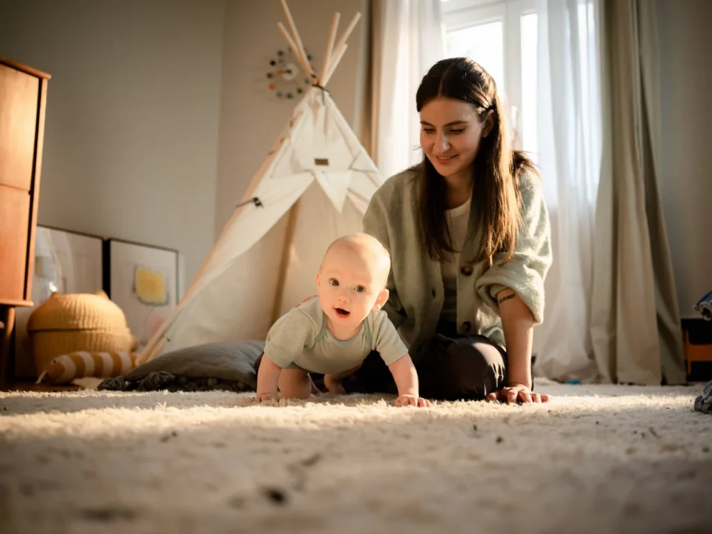✓ Desloca-se rolando ou rastejando. Podem também gatinhar, mas alguns só o fazem a partir dos 10/11 meses. A posição de gatas fornece um grande input para a mão, desde o alongamento dos tecidos moles da palma, até ao reforço dos arcos palmares em resposta às reações de equilíbrio preparando para os padrões de preensão;